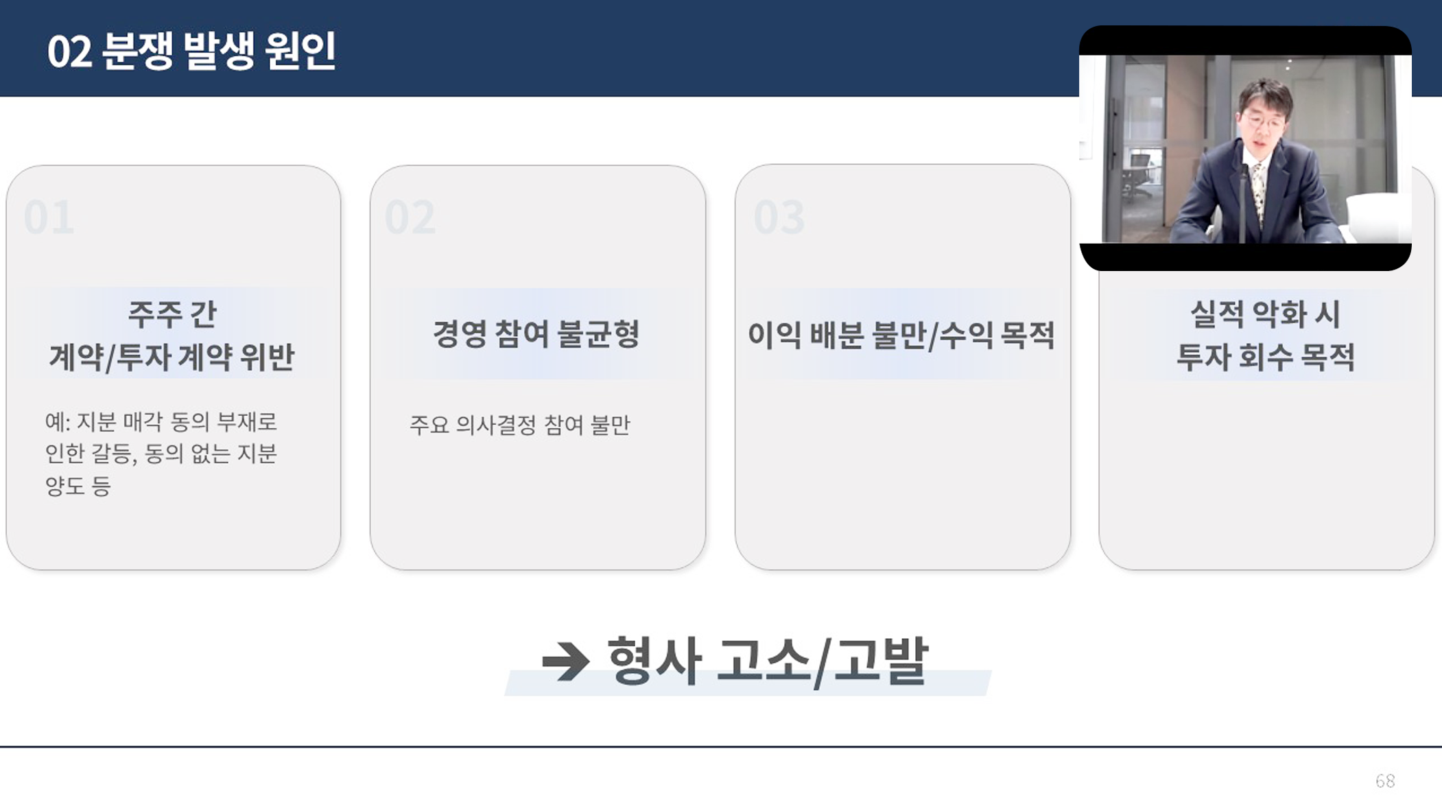 본 웨비나는 스타트업 및 기업 관계자를 대상으로 ‘다양한 유형의 주주 간 분쟁사례와 분쟁 발생 후 대응전략’에 대해 소개하여 분쟁 시 기업이 적극적으로 대처할 수 있게 개최되었습니다.