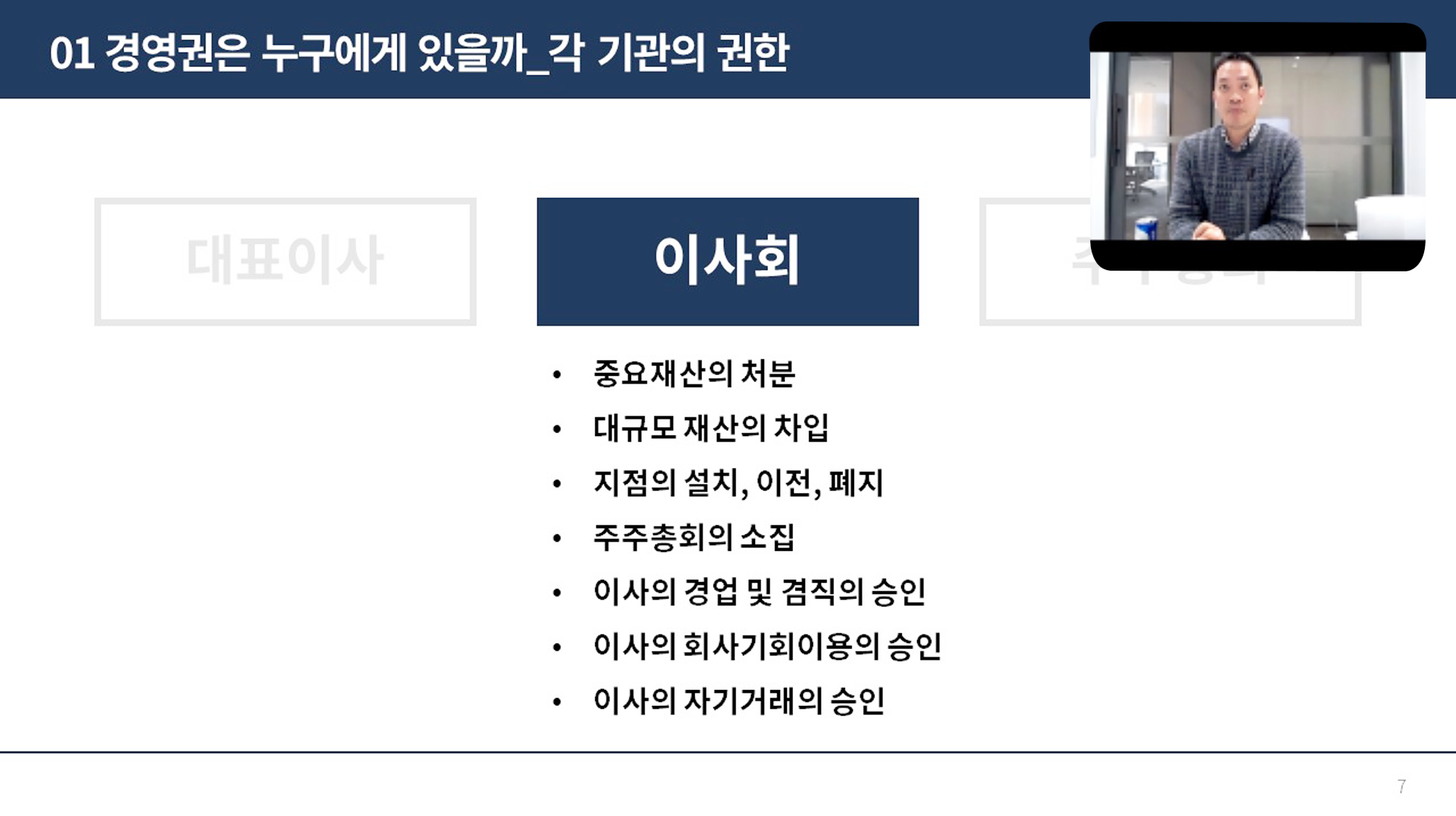 첫 번째 세션에서 정호석 변호사는 ‘주주 간 분쟁 상황에서의 경영권 확보 방안’을 주제로 각 주주, 기관별 권한과 경영권 확보 후 대응 방안에 대해 소개하였습니다. 특히 상대방에 대한 공격 방안 마련, 접근권 차단 등 실제 분쟁 상황에서 기업이 적극적으로 대응하는데 필요한 부분까지 상세히 설명하였습니다.