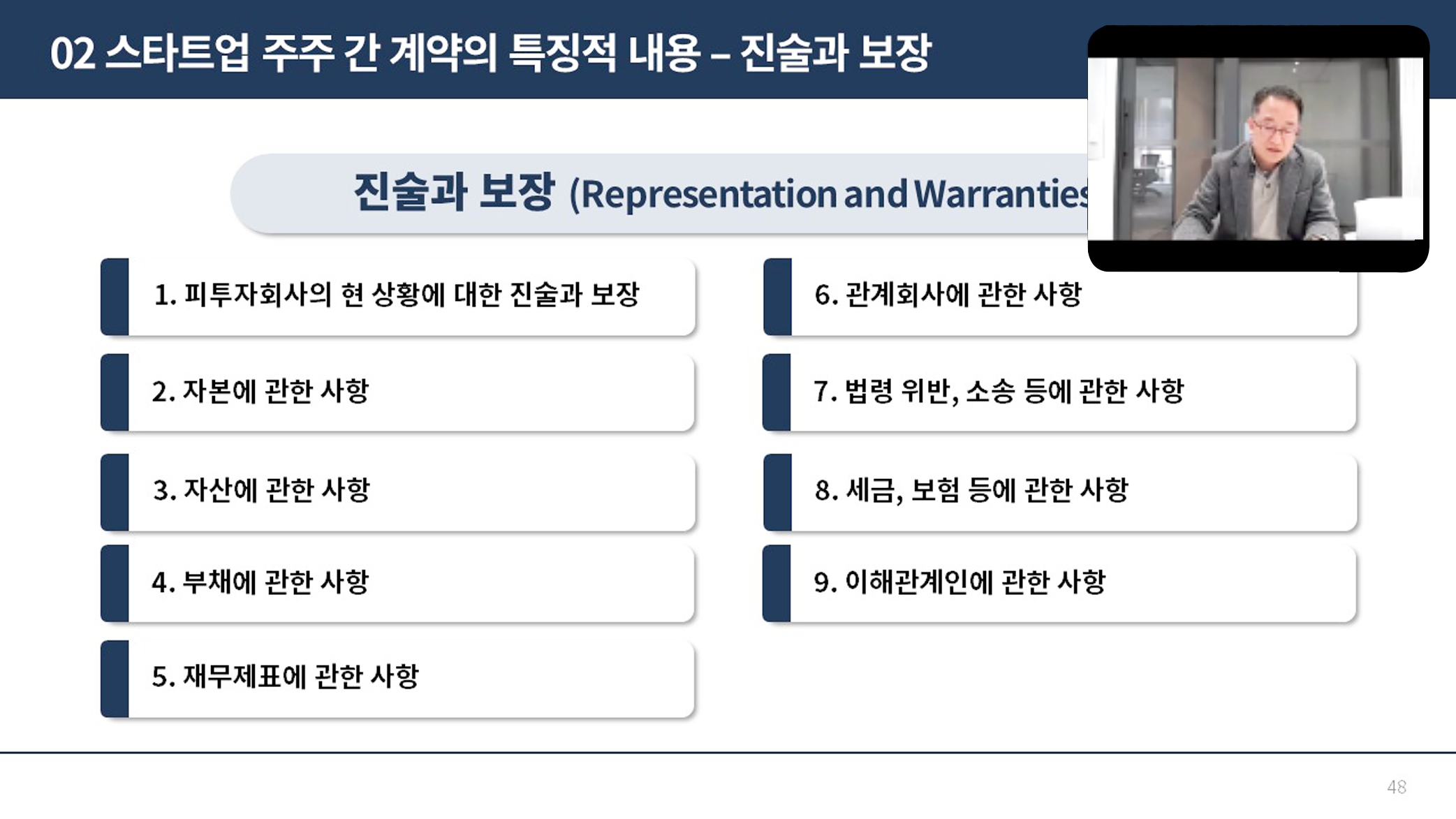 또한 변승규 변호사는 ‘주주 간 분쟁 시 투자계약 및 주주 간 계약상 권리 주장 및 대응 방안’을 주제로, 투자금의 용도 제한 및 실사, 주식매수청구권, 위약벌 등 각 항목별 관련 법률을 살펴보며 투자자와 창업자에게 요구되는 사항에 대해 면밀하게 짚어주었습니다.