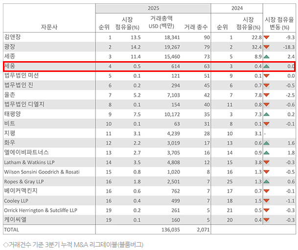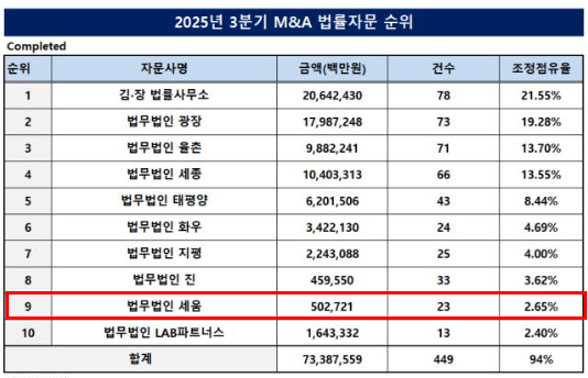 [공지] 법무법인 세움, 2025년 3분기 '대한민국 M&A 리그테이블' 4위 달성
