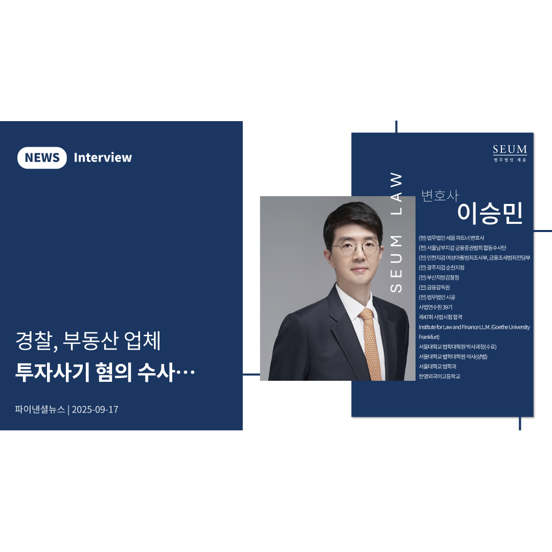 SEUM의 이승민 변호사는 2025년 9월 17일 (수), 부동산 업체 대표 A씨의 사기 혐으로 인한 불구속 기소를 다룬 기사에서 기업법무 및 자본시장 전문가로 의견을 밝혔습니다.